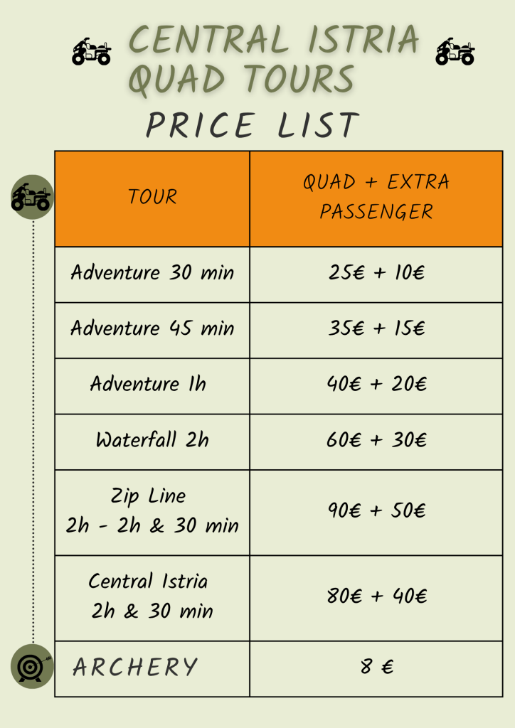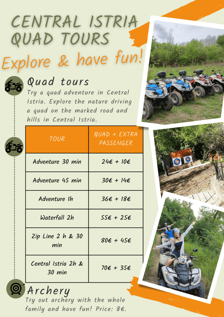 Central Istria Quad Tours offers to our visitors adventures with quads on the marked road through the forest and archery for the whole family. We are located in Central Istria, in the small village Kirci, near Beram (Pazin).